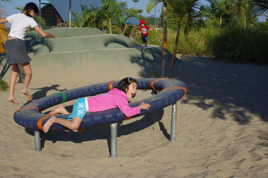 公園で新しい遊びを見つけた娘達、早速挑戦。