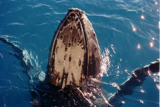 写真は、鯨が船のすぐ横に垂直に浮上した写真です。