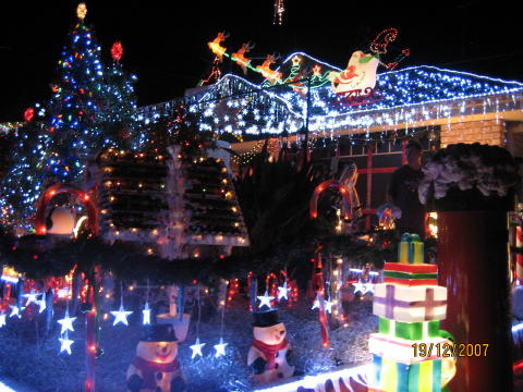 道路の両側の民家がみんなイルミネーションで飾っています。