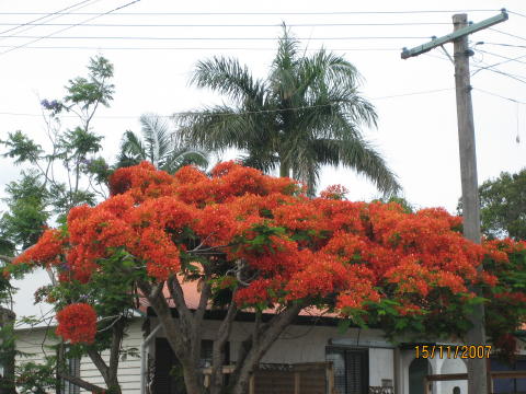 12月になると、朱色のポインシアーナが咲き乱れます。